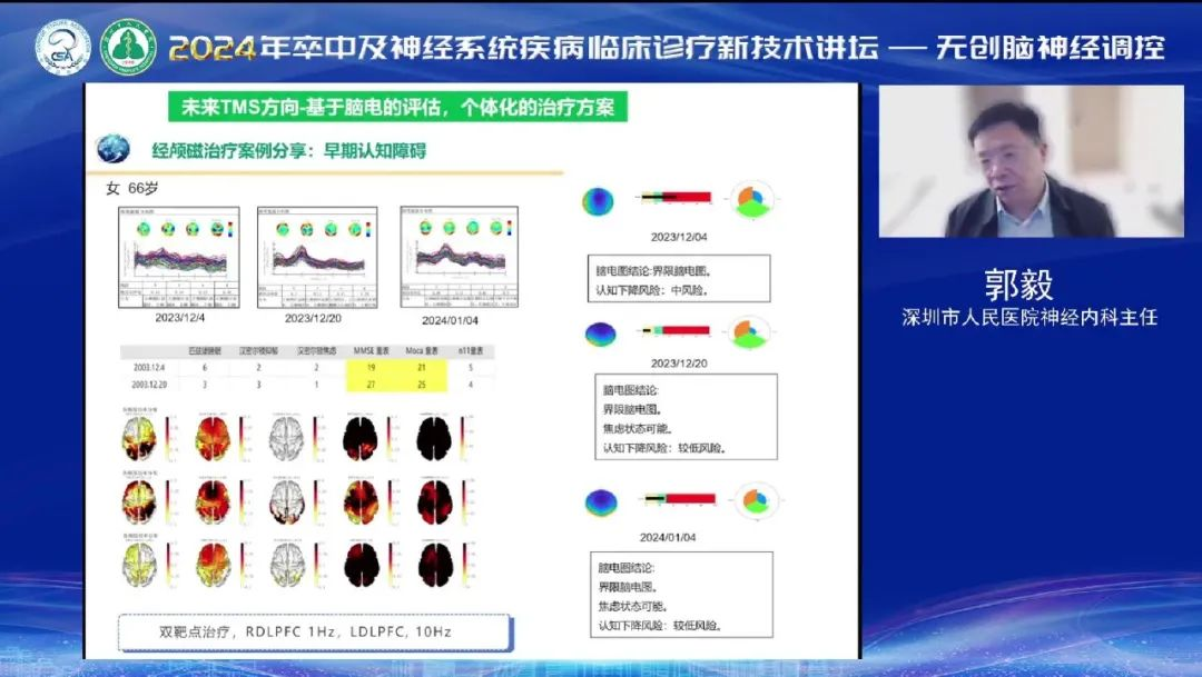 郭毅主任詳細介紹了一個治療病例:66歲女性在前兩家醫院診斷為癡呆。入院后進行腦電評估,結果提示認知下降為中風險,采用雙靶點刺激方案治療16天(1Hz RDLPFC+10Hz LDLPFC)。療程結束后,復查腦電發現患者腦電明顯改善,認知下降為較低風險,接近于正常,MMSE16分到27分。
