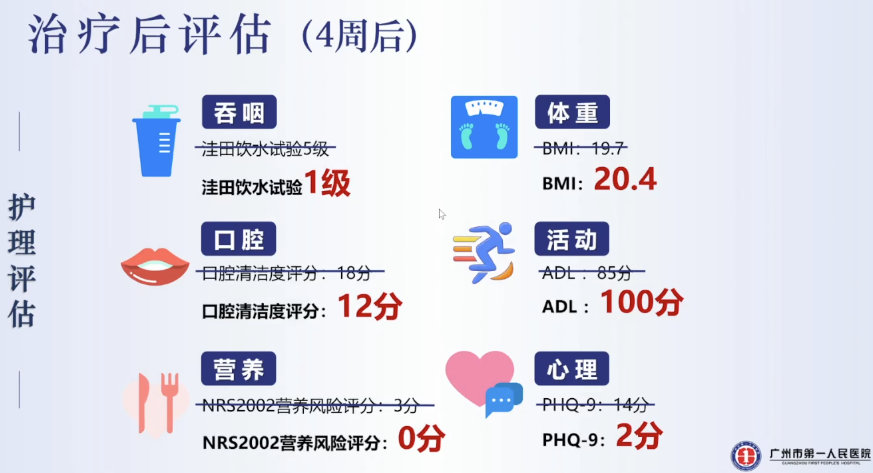 經(jīng)過4周的精準(zhǔn)化治療,患者在臨床、康復(fù)、護(hù)理方面都有了明顯的改善,能自主吞咽各種性狀的食物,達(dá)到康復(fù)出院的標(biāo)準(zhǔn)。出院后持續(xù)隨訪,得知患者并沒有再次出現(xiàn)吞咽困難或飲水嗆咳。