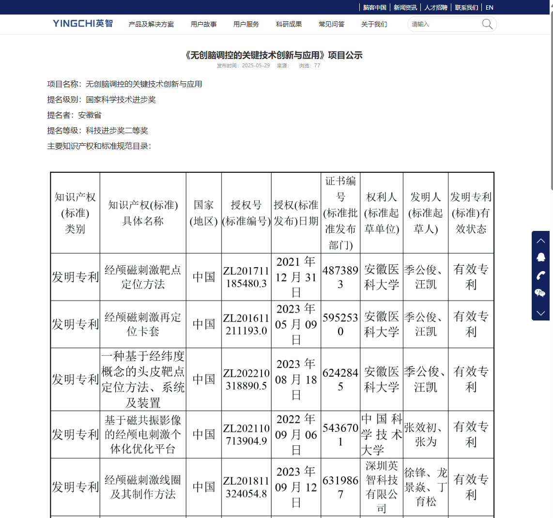 英智科技的經(jīng)顱磁刺激治療儀已通過中國NMPA、美國FDA、歐盟CE等認證。其產(chǎn)品在治療重度抑郁癥、慢性疼痛等領(lǐng)域的療效已獲多項臨床研究驗證。另外2025年其與國內(nèi)多個研究機構(gòu)聯(lián)合發(fā)表的《無創(chuàng)腦調(diào)控的關(guān)鍵技術(shù)創(chuàng)新與應用》項目,提名國家科技進步獎,進一步彰顯其技術(shù)實力。