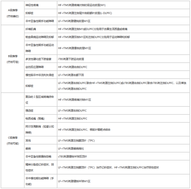 除了正在進行的臨床試驗,美國食品和藥物管理局(FDA)對經顱磁刺激治療相關適應癥的批準也為臨床應用奠定了基礎。這里我們回顧了FDA對經顱磁刺激治療批準的相關適應癥以及國際臨床神經生理學聯盟(IFCN)rTMS臨床治療指南中的推薦適應癥。
