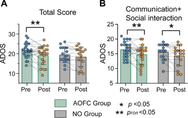Figure 1: Changes in (A) ADOS total scores and (B) ADOS communication + social interaction scores before and after treatment in the AOFC and NO groups induced by cTBS.