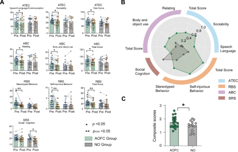 The team studied the effects of cTBS treatment on various ASD-related outcome measures: Autism Treatment Evaluation Checklist (ATEC), Autism Behavior Checklist (ABC), Social Responsiveness Scale (SRS), and Repetitive Behavior Scale (RBS). In the AOFC group, significant reductions were observed in the ATEC, ABC, and RBS total scores, while in the NO group, only the SRS score showed a significant decrease (Figure 2A). Effect sizes before and after treatment were compared, and in most symptom and behavior measures, the AOFC group consistently showed larger effect sizes than the NO group (Figure 2B). The average of all measurements from these scales was then calculated. The AOFC group demonstrated greater improvement in ASD-related outcome measures compared to the NO group (t = 2.09, p = 0.045, Cohen’s d = 0.70) (Figure 2C). These results indicate that after cTBS treatment, the AOFC group showed significant improvements across a range of ASD-related measures, with larger effect sizes observed in most measurements compared to the NO group, which only showed a significant decrease in the SRS score.