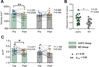 Resting-state fMRI data measured the local functional changes in the amygdala following cTBS treatment. The AOFC group showed a significant decrease in ALFF in the right amygdala (t = -2.671, p = 0.016, Cohen’s d = 0.85) (Figure 3C). The NO group showed no changes in the right amygdala (t = -1.189, p = 0.254, Cohen’s d = 0.39). No significant changes were observed in the left amygdala for either group. These results suggest that cTBS treatment in the AOFC group led to a significant reduction in spontaneous neural activity in the right amygdala, whereas no such change was observed in the NO group.