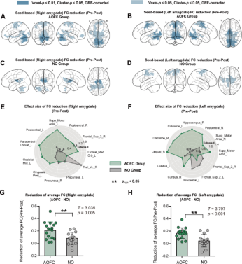 Figure 4. (A, B) Reduction in functional connectivity (FC) of left and right amygdala seed regions induced by cTBS treatment in the AOFC group. (C, D) Reduction in FC of right and left amygdala seed regions after treatment in the NO group. (E) Effect size of FC reduction between the right amygdala and selected cortical regions in the AOFC and NO groups. (F) Effect size of FC reduction between the left amygdala and selected cortical regions in the AOFC and NO groups. (G) Differences in average reduction of functional connectivity between the right amygdala and target brain regions in the AOFC and NO groups. (H) Differences in average reduction of functional connectivity between the left amygdala and target brain regions in the AOFC and NO groups as shown in E.