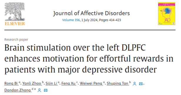 Bi, R., Zhao, Y., Li, S., Xu, F., Peng, W., Tan, S., & Zhang, D. (2024). Brain stimulation over the left DLPFC enhances motivation for effortful rewards in patients with major depressive disorder. Journal of Affective Disorders, 356, 414-423.