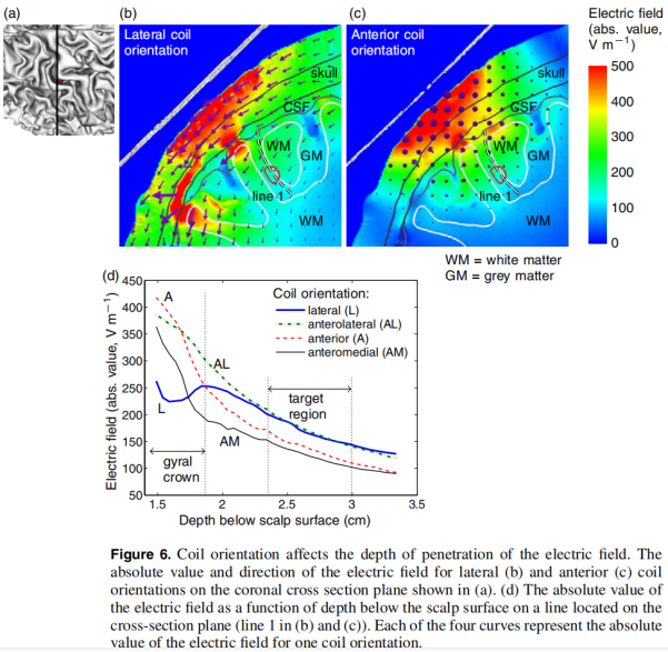 Ilkka Laakso et al. calculated and studied the induced electric field in multiple coil directions and positions to determine which parts of the brain are affected, and how the sensitivity of motor cortex activation depends on the direction of the electric field. The electric field induced by TMS in two independent anatomical models of the head and brain was calculated by finite element method.