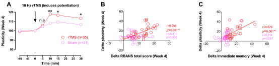 ④rTMS enhanced cortical plasticity, and enhanced plasticity at week 4 was positively correlated with improvement in immediate memory and RBANS total scores.